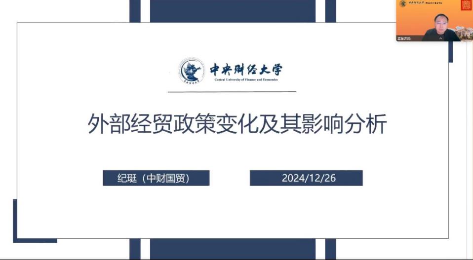 紀 珽(伟德平台怎么样副教授、貿易經濟系主任)做了題為《外部經貿政策變化及其影響分析》的專題報告: